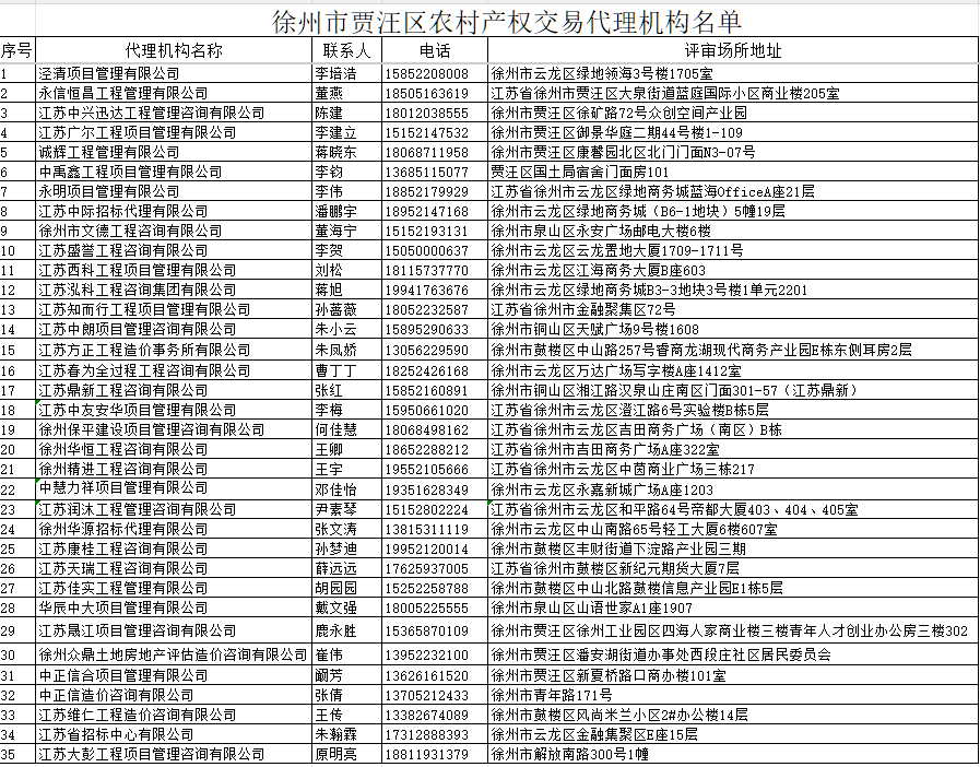 徐州市贾汪区农村产权交易代理机构名单